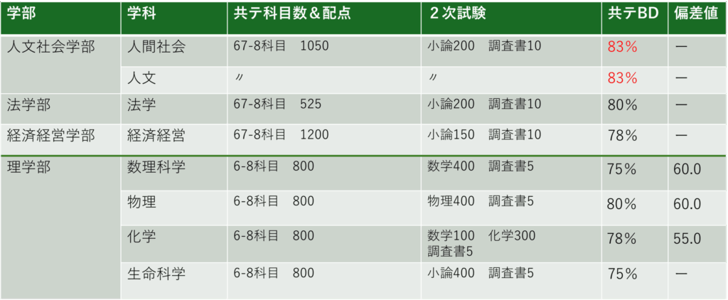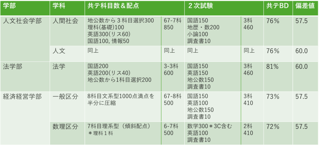 一般の国公立大の文系学部の場合、共通テストは8科目の受験になります。ただ、上の表をご覧の通り、文系学部で共通テスト8科目を課すというのは経済経営学部の一般区分だけになります。人文社会学部は7科目、法学部に至っては3科目の受験になります。