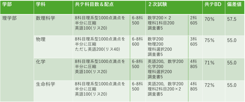 共通テストは、全学部で8科目フルでの受験になります。配点もほぼ一緒になりますが、物理学科のみ英語の配点が200点と高くなっています。