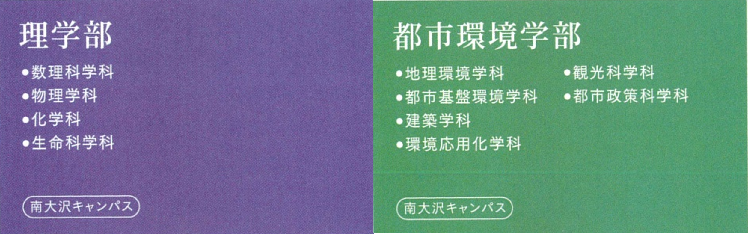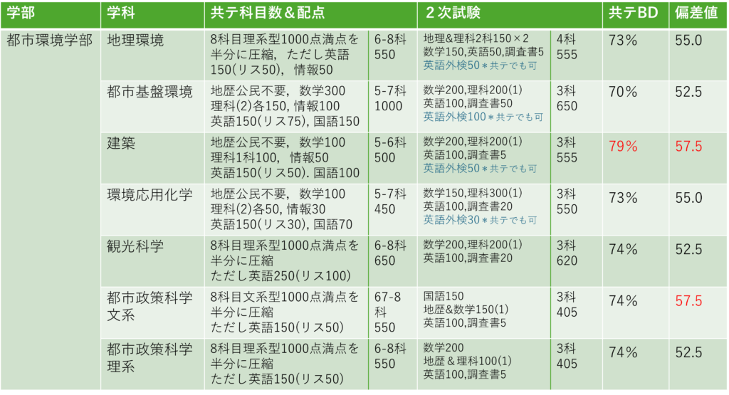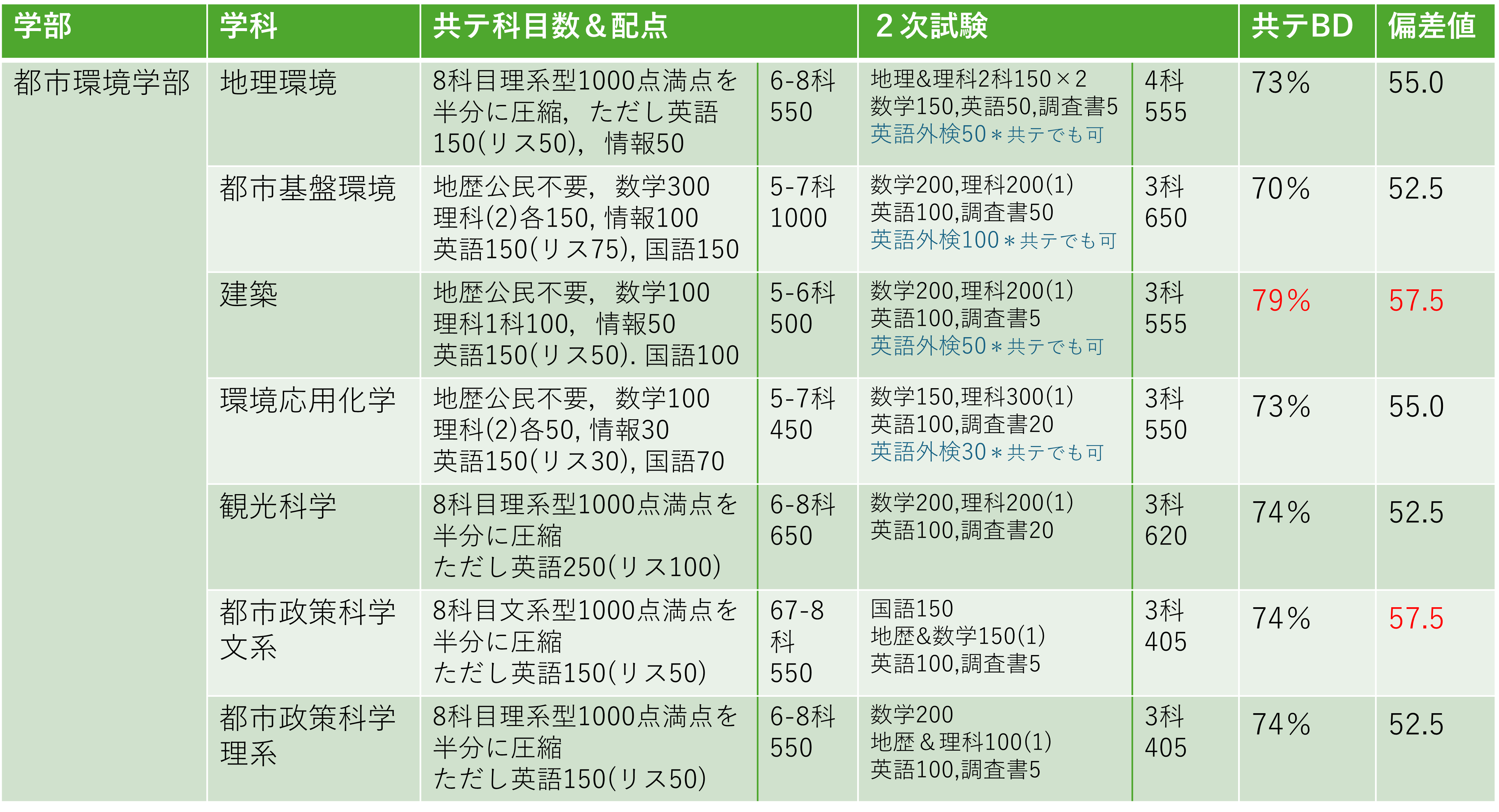 都市環境学部は、地理環境学科、都市基盤環境学科、建築学科、環境応用化学科、観光科学科、都市政策科学科の6学科で、都市政策科学科は文系からも受験が可能になっています。