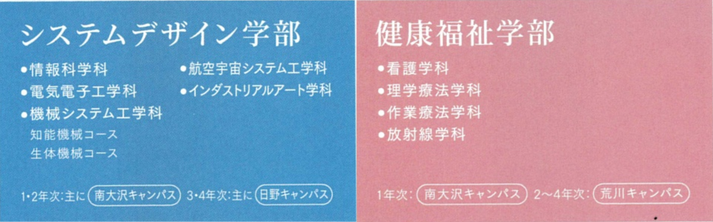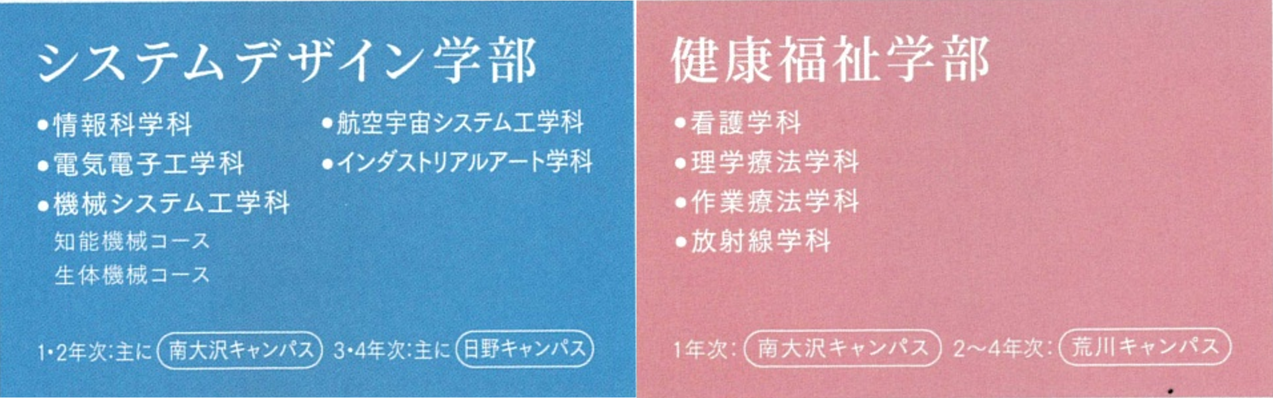 システムデザイン学部は、情報科学科、電気電子工学科、機械システム工学科こちらは知能機械コースと生体機械コース、航空宇宙システム工学科、インダストリアルアート学科の5学科。こちらは、1・2年次が南大沢キャンパス、3・4年次が日野キャンパスです。
