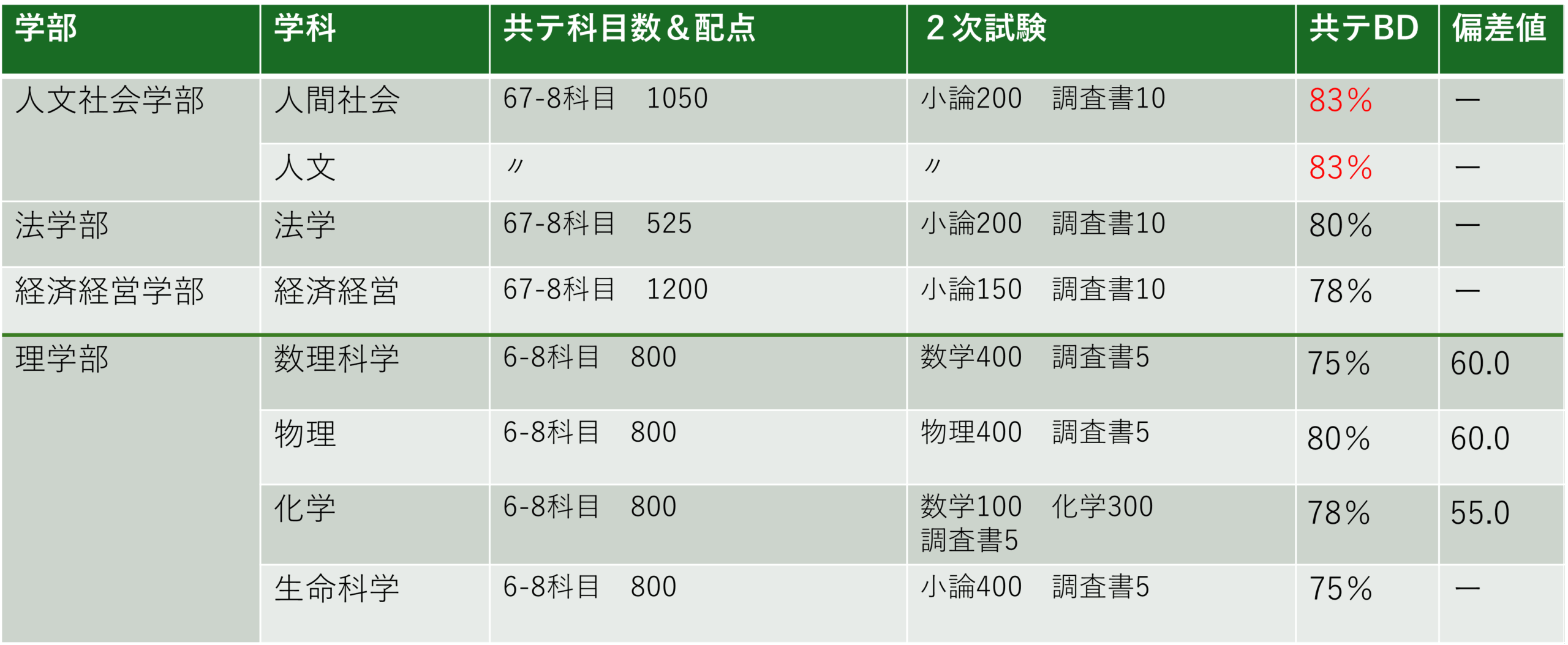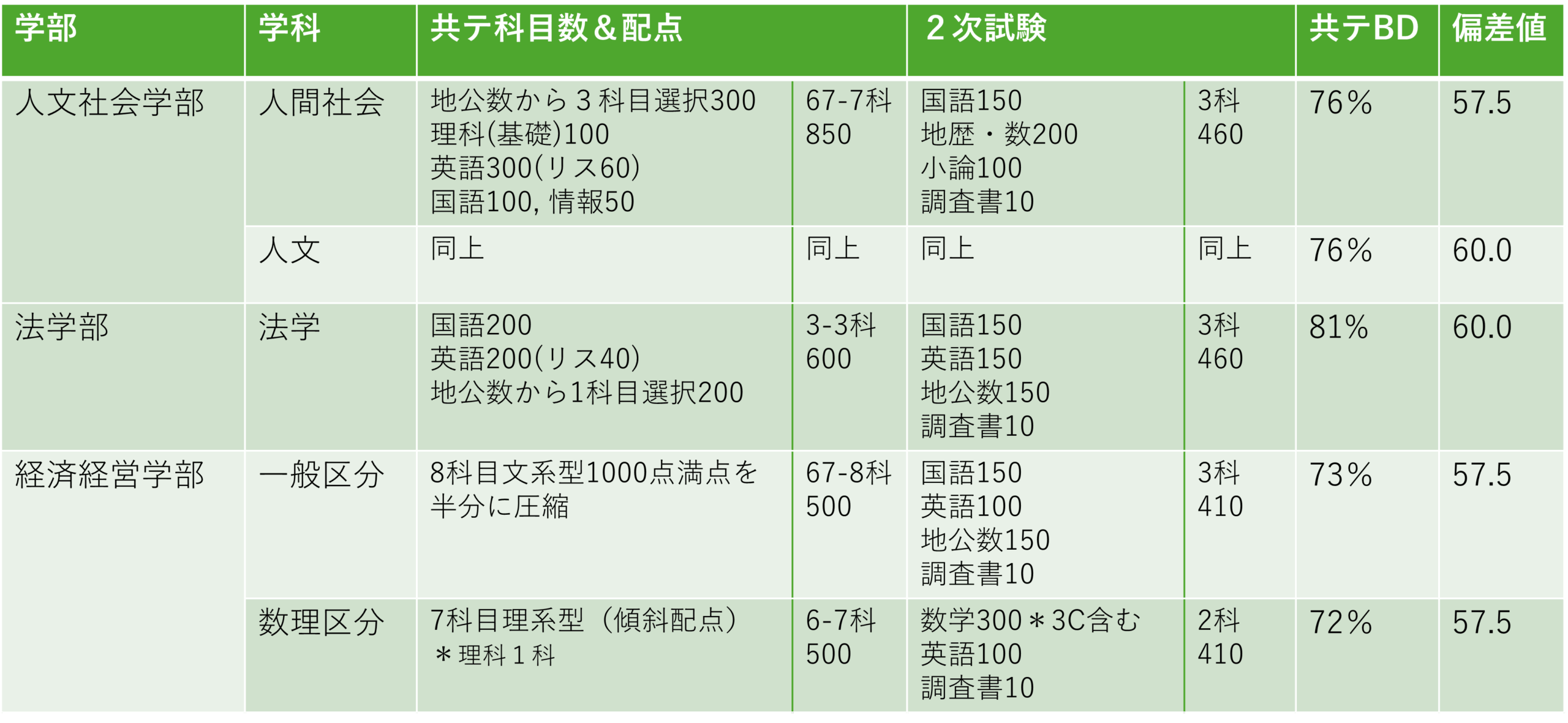 一般の国公立大の文系学部の場合、共通テストは8科目の受験になります。ただ、上の表をご覧の通り、文系学部で共通テスト8科目を課すというのは経済経営学部の一般区分だけになります。人文社会学部は7科目、法学部に至っては3科目の受験になります。