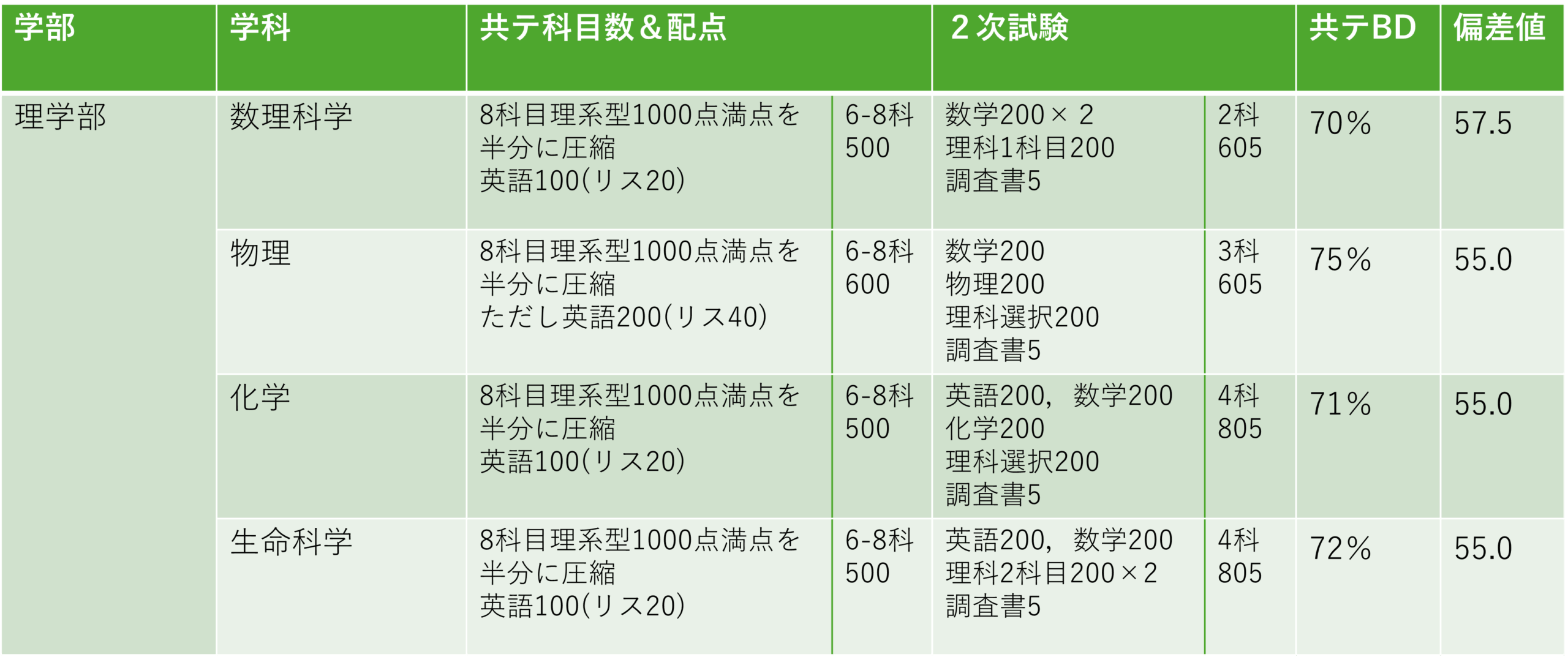 共通テストは、全学部で8科目フルでの受験になります。配点もほぼ一緒になりますが、物理学科のみ英語の配点が200点と高くなっています。