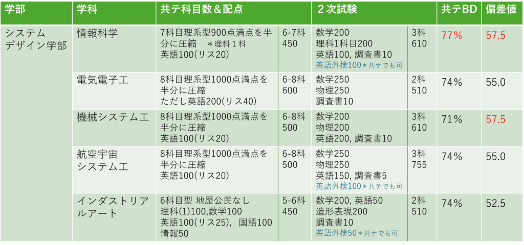 都市基盤環境学科は、共通テストで地歴公民が不要、情報科目の配点が少し高めです。2次試験は、理科1科目でよく、共通テストに比べると配点比率が低くなっています。