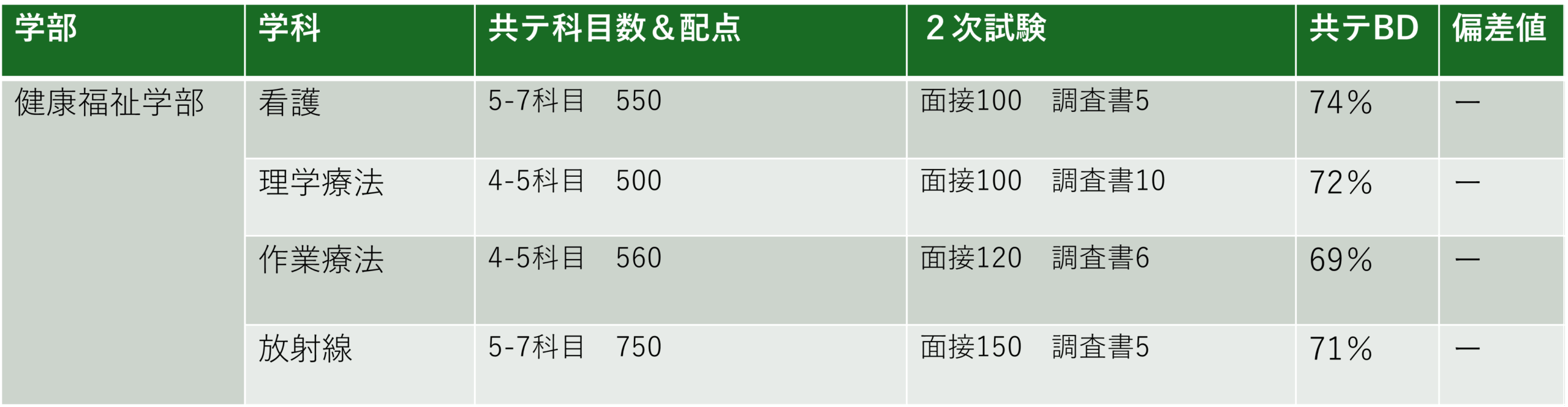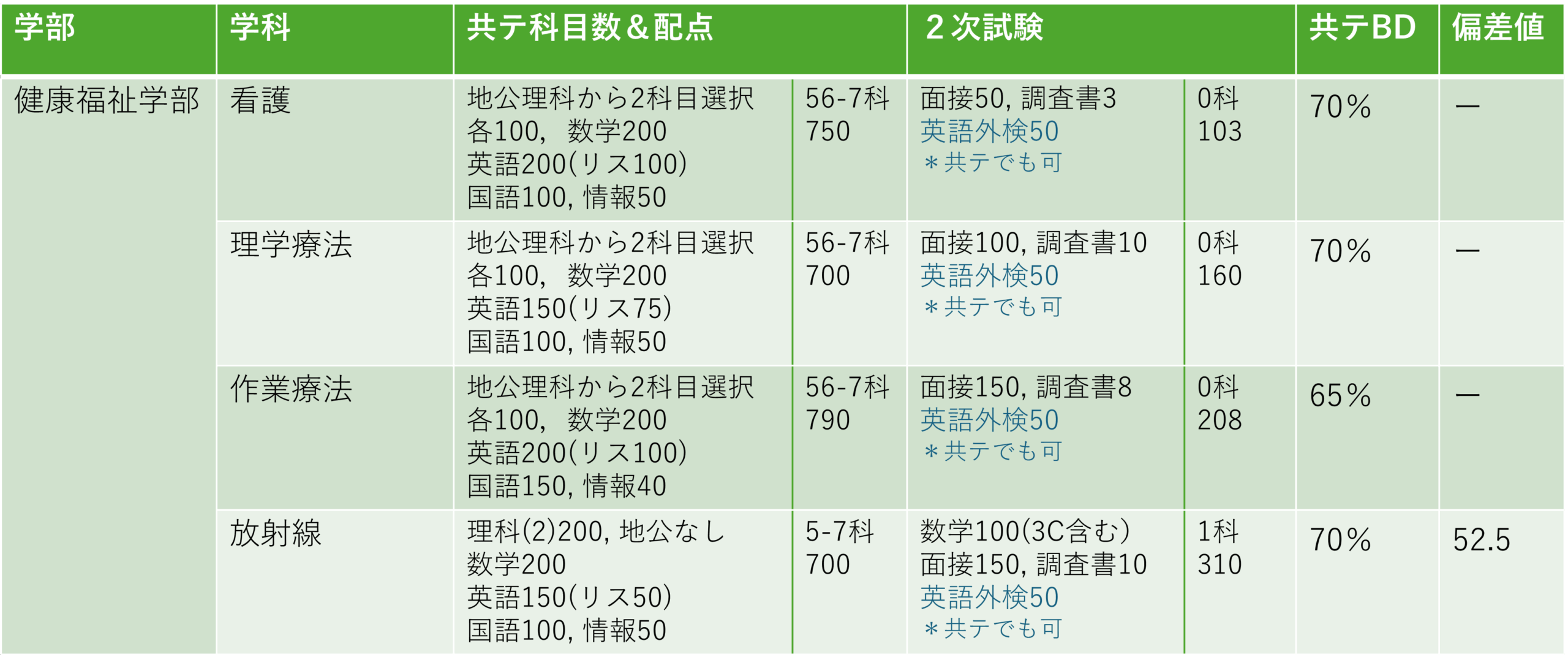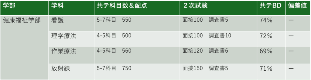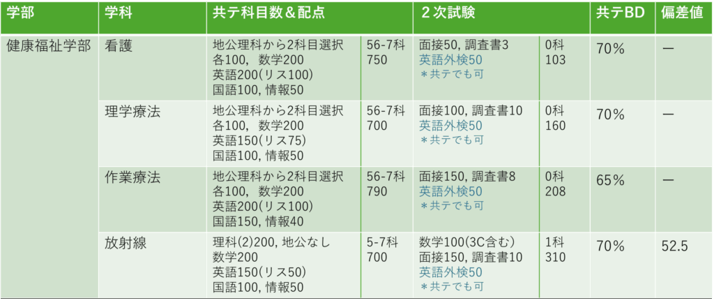 放射線学科では2次試験で数学が実施されますが、それ以外の学科では面接のみで、他には調査書の得点のみです。つまり、共通テストの比率がとても高いということになります。