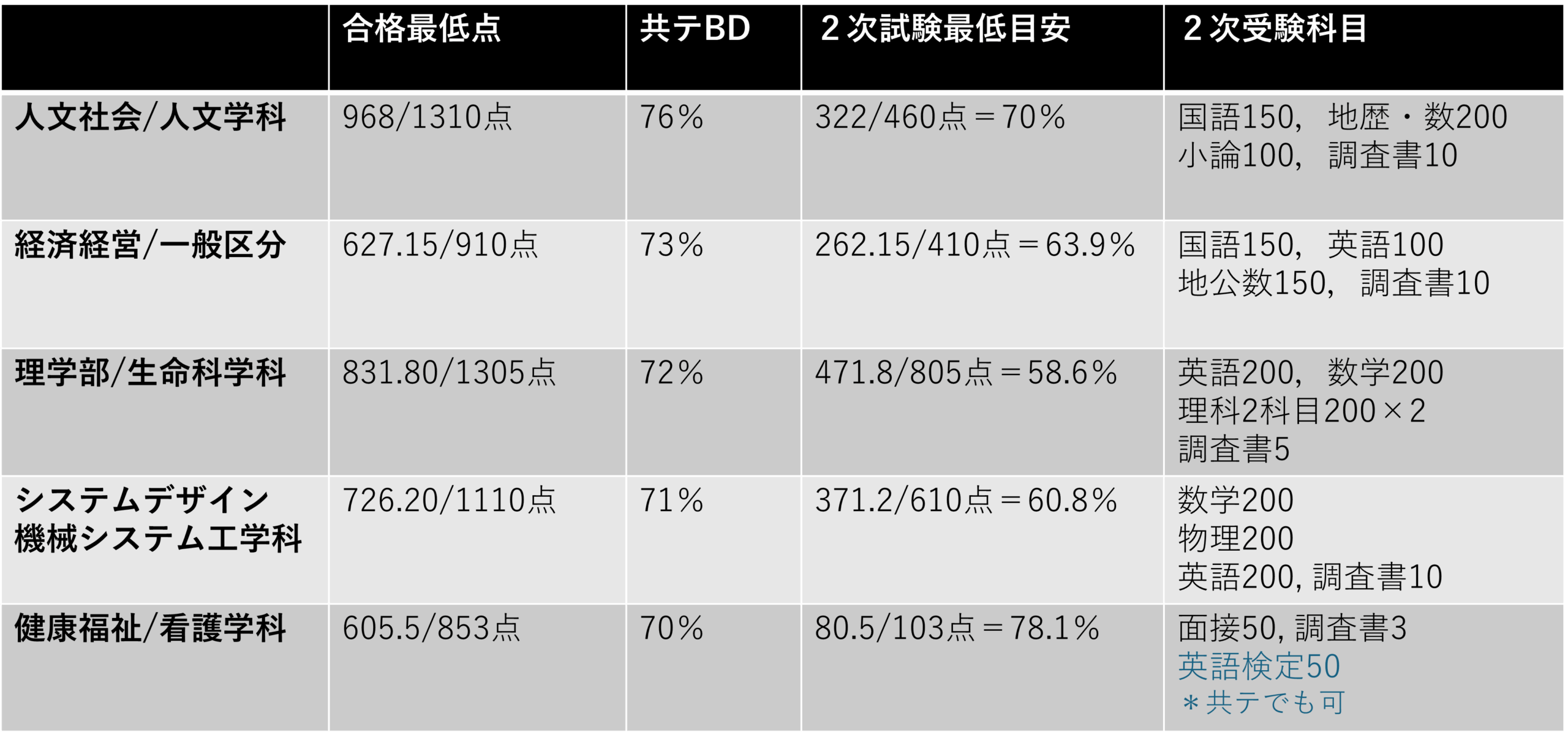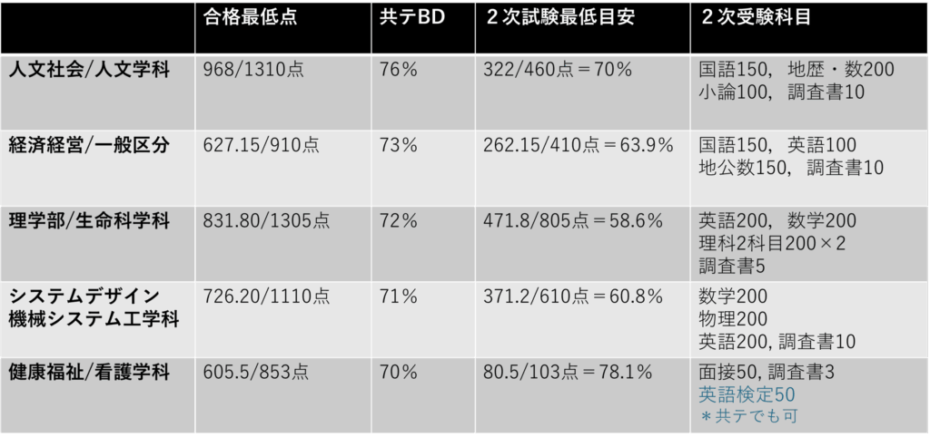 全体的に、前期日程よりも後期日程の方が共通テストのボーダーラインが高くなっています。人文社会学部は両学科ともに83%、都市環境学部建築学科で84%、システムデザイン学部情報科学科で81%とかなりのレベルになっています。また、2次試験の配点比率は前期日程に比べるとおおむね低くなっています。ですので、共通テストである程度高得点を取っておく必要があります。