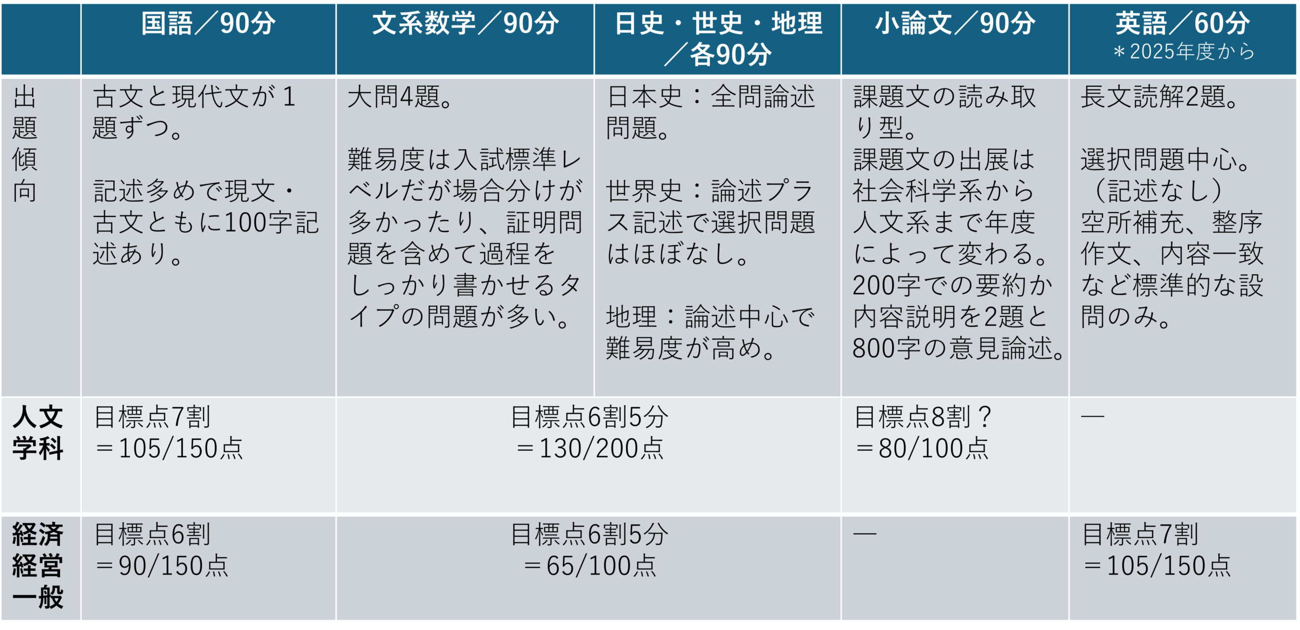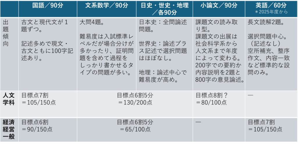 2次試験は、合計が460点と共通テストの比重が高めになっています。また、文系学部なのに英語がありません。小論文とあるのも、いわゆる普通の小論文であって英語は全く含まれていません。