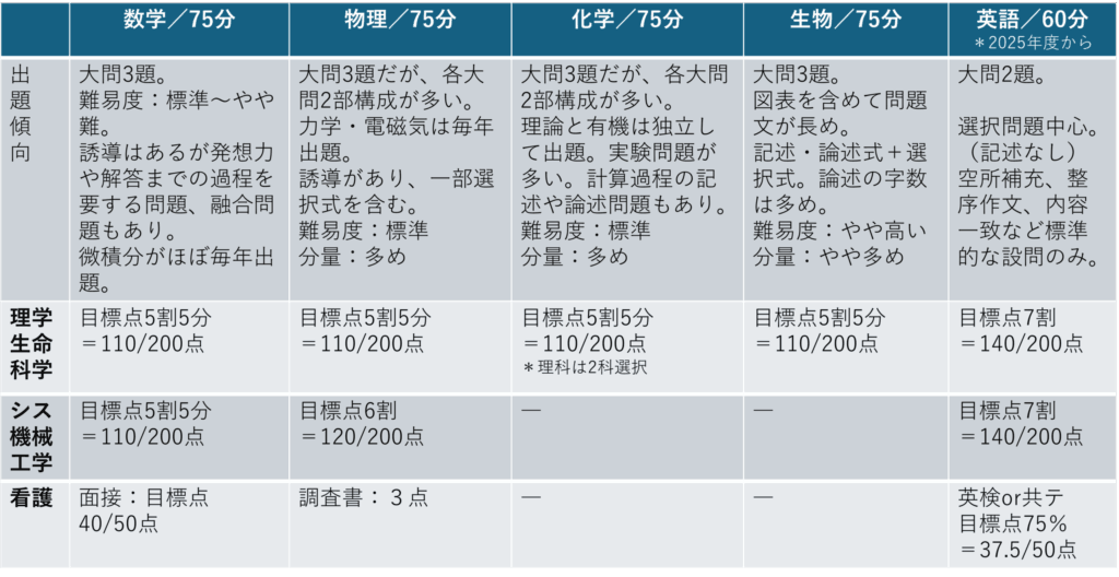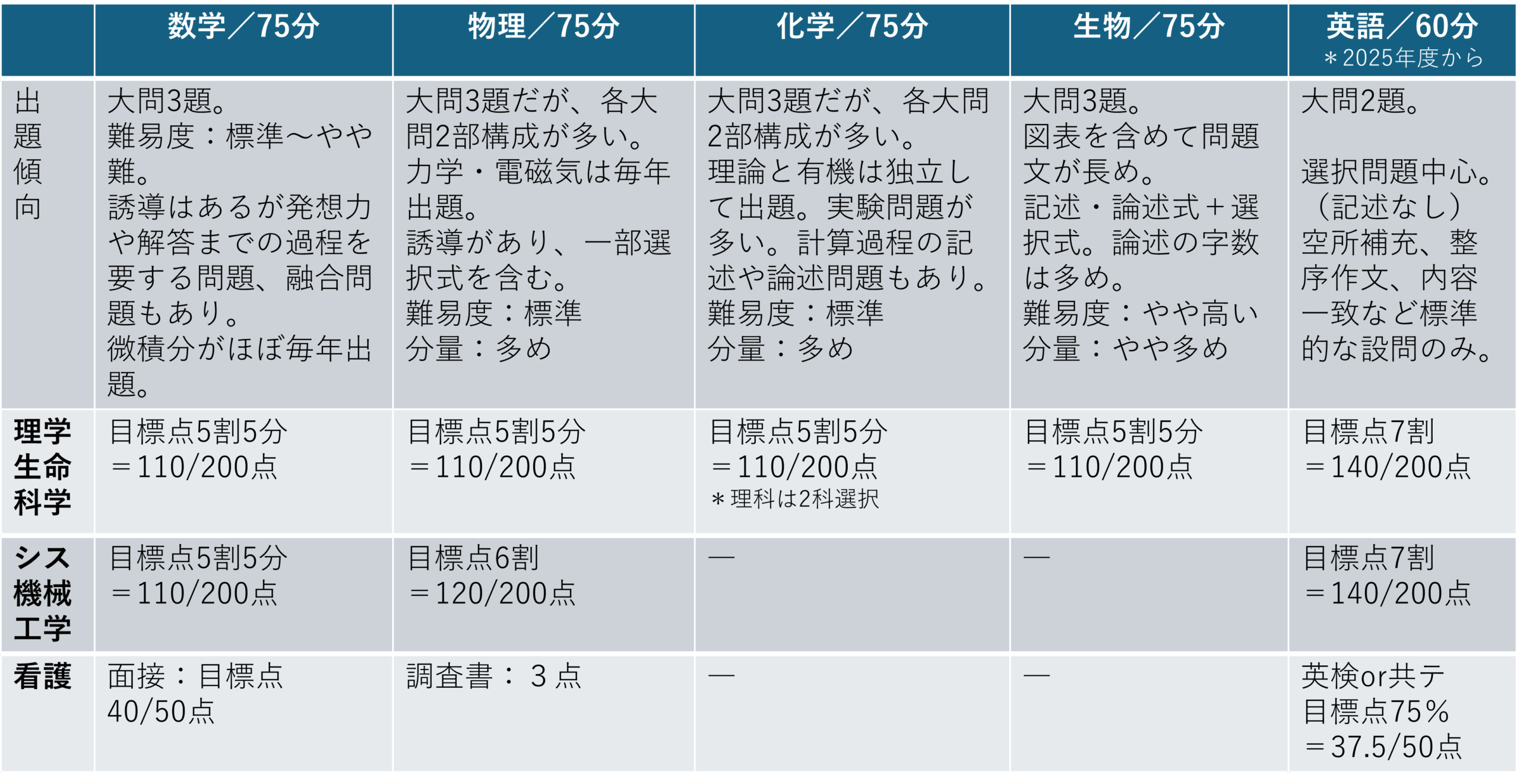 物理は、比較的オーソドックスな国立型になっていますが、小問が細かく分かれていて誘導のある問題が多いです。化学は、実験問題がかなりの割合で出題されています。また、計算過程の記述や論述問題もあり、難易度は標準的ですが分量が多めになっています。生物は、図表を含めて問題文が長く、論述式の字数が多くなっています。