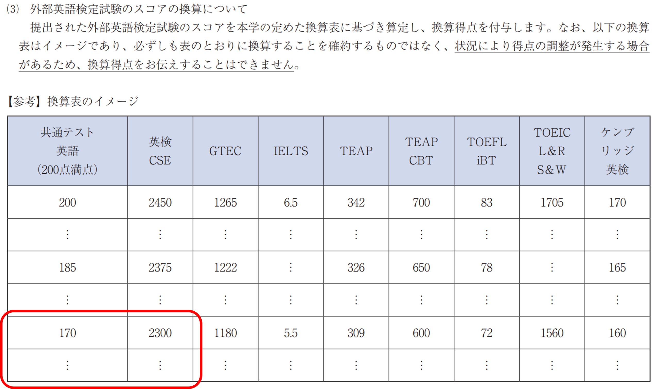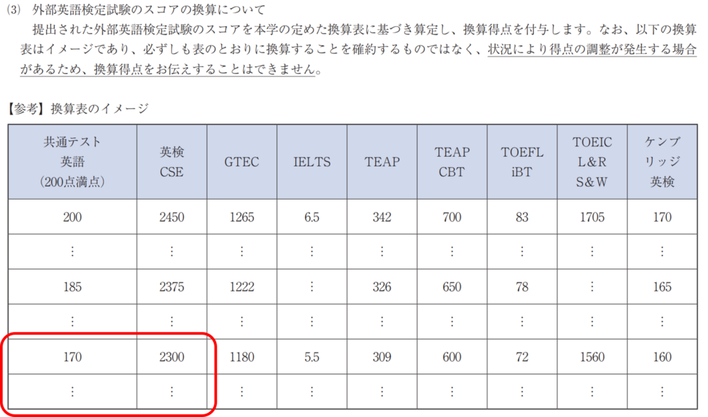 例えば、英検で2300点と準1級に近いくらいの点を取った場合、共通テストの170点を取ったくらいの点数に換算するということかと思います。